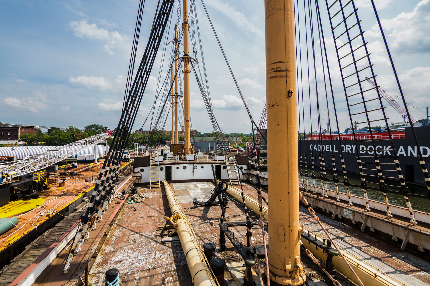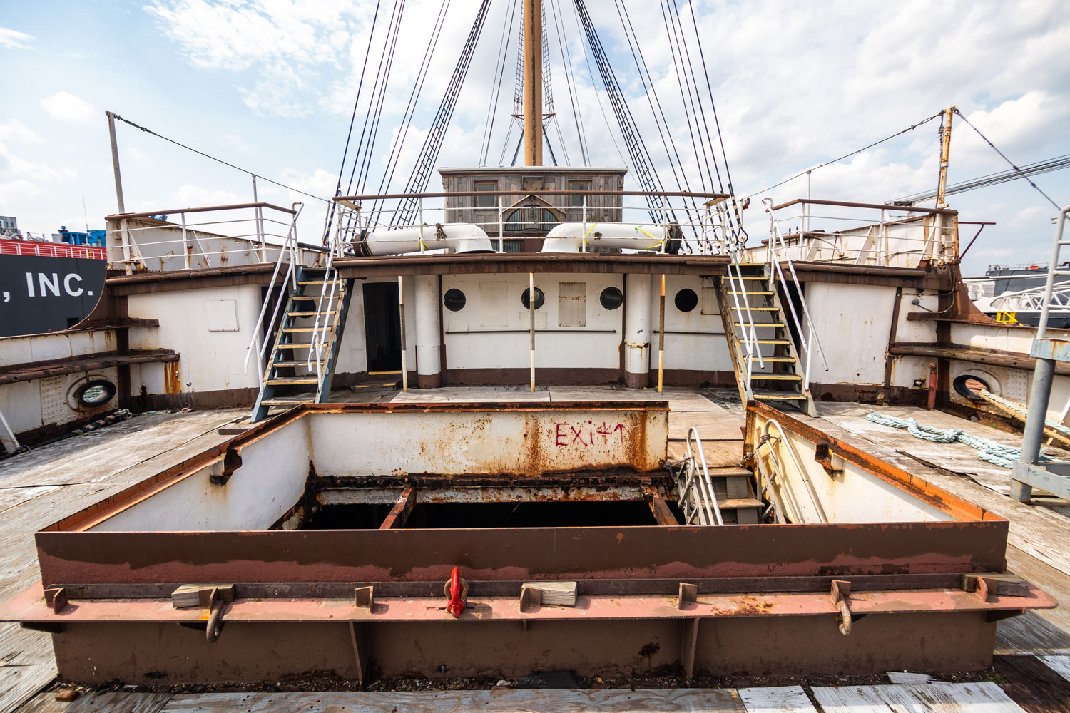 Die PEKING lag an der Pier auf dem Gelände der Caddell Werft in Staten Island. Ganz nebenbei gesagt, verfügt diese alte Traditionswerft über das älteste Trockendock in New York. In den vorherigen Monaten wurde die Viermastbark hier entrümpelt und für den Transport vorbereitet. Unter anderem wurden nahezu alle Rahen demontiert. Verschont blieben zwei Originale Rahen, alle anderen waren Nachbauten aus einer New Yorker Straßenlaternenfabrik und wurden entsorgt.
