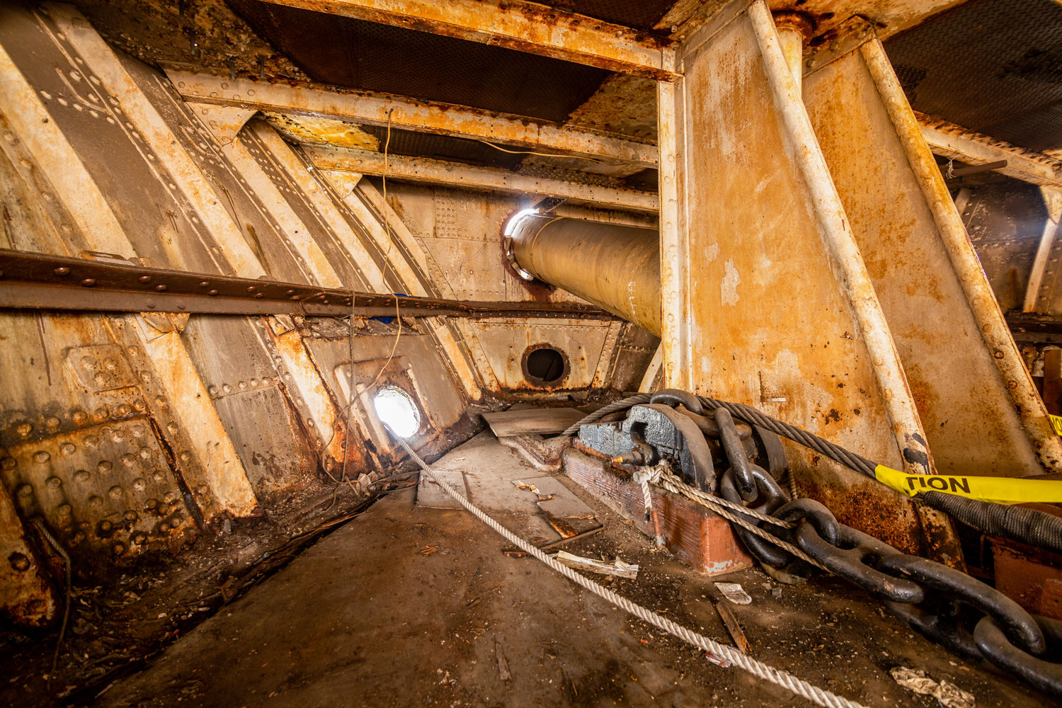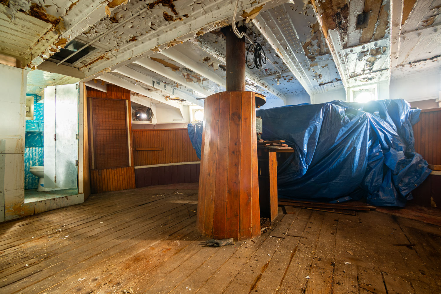 In vielen Bereichen, insbesondere unter Deck, musste man wirklich aufpassen, wo man hin trat. Immer wieder gab es Stellen, an denen man einbrechen oder mehrere Meter in die Tiefe hinab stürzen konnte. Der alte Holzboden wurde teilweise mit großen Platten abgedeckt, da die darunterliegende Struktur einfach zu marode war. Absperrbänder markierten besonders gefährliche Bereiche.