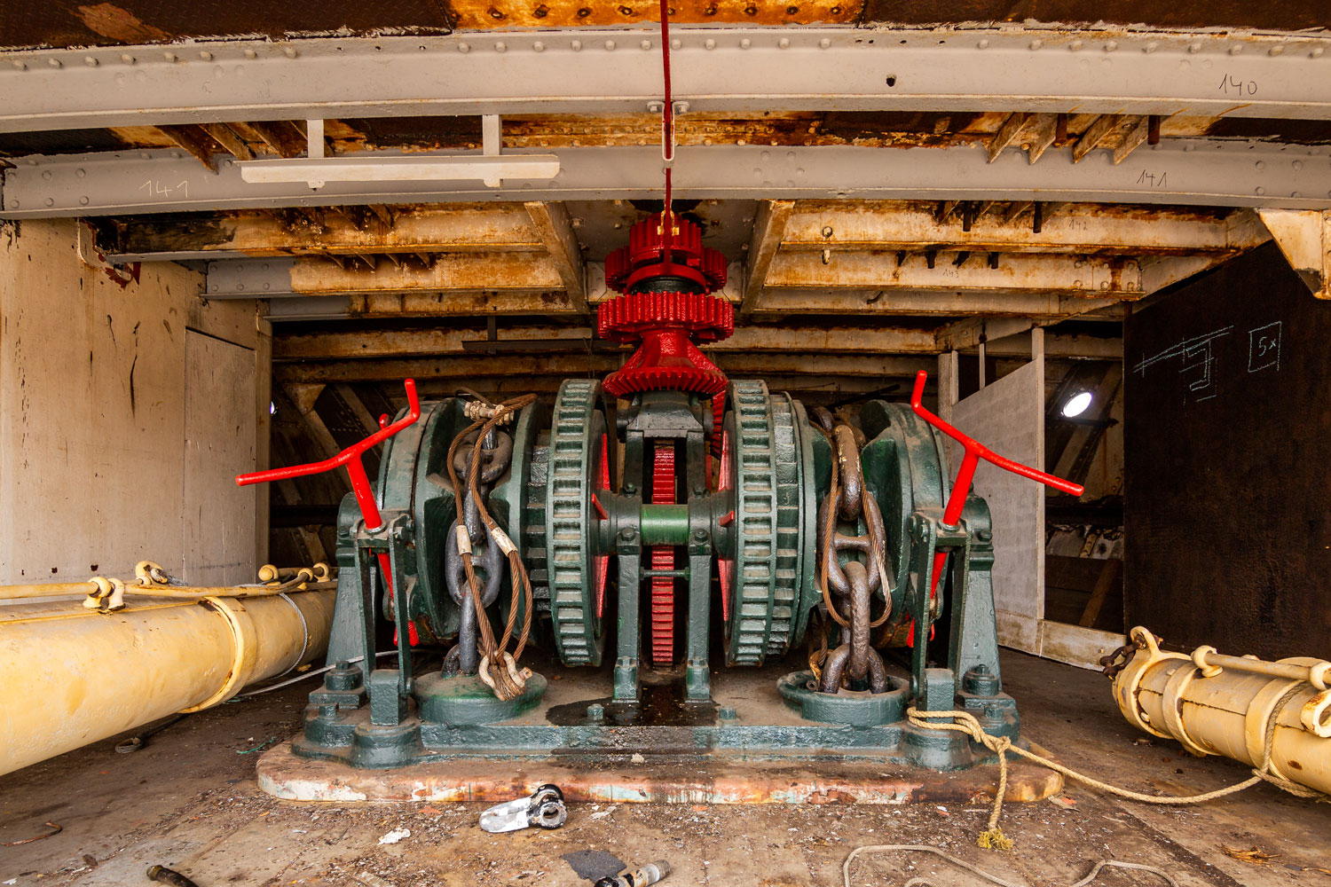 Rechts sieht man die Ankerwinde aufgearbeitet und neu lackiert – mehr geht nicht, weil eine Demontage dieser Guss-Konstruktion viel zu riskant war. Links und rechts die Bandbremsen für den Backbord- bzw. Steuerbord-Anker.