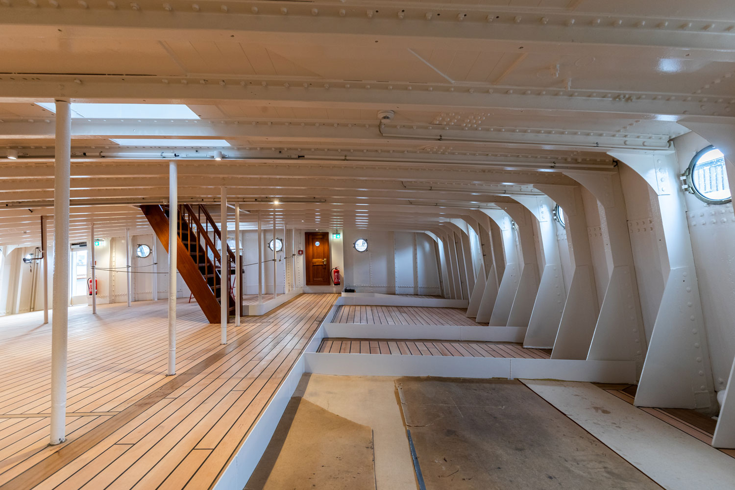 Aus dieser Perspektive gibt es von mir leider kein Motiv aus der Zeit vor der Sanierung. Das linke Bild zeigt den langen Flur – die Verbindung zwischen dem vorderen und achteren Hauptdeck. Hinten links ist der Niedergang vom Kartenhaus. Auf dem Boden sind die provisorischen Umrisse der Offizierskammern im November 2021 zu sehen, rechts im Bild sind stand heute die Räumlichkeiten bereits fertig. Ganz rechts sieht man ebenfalls, das mit dem Innenausbau der Kammern begonnen wurde.