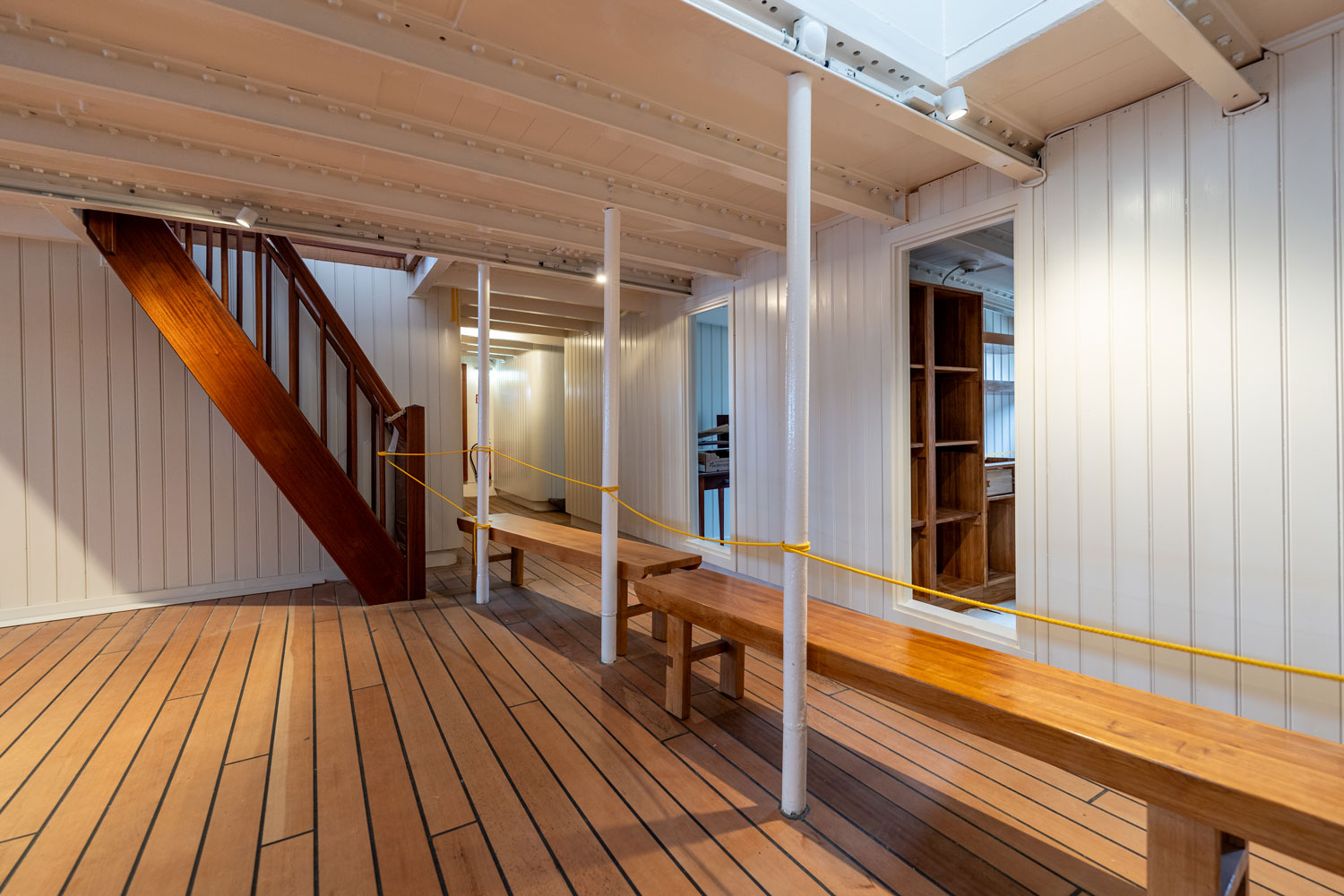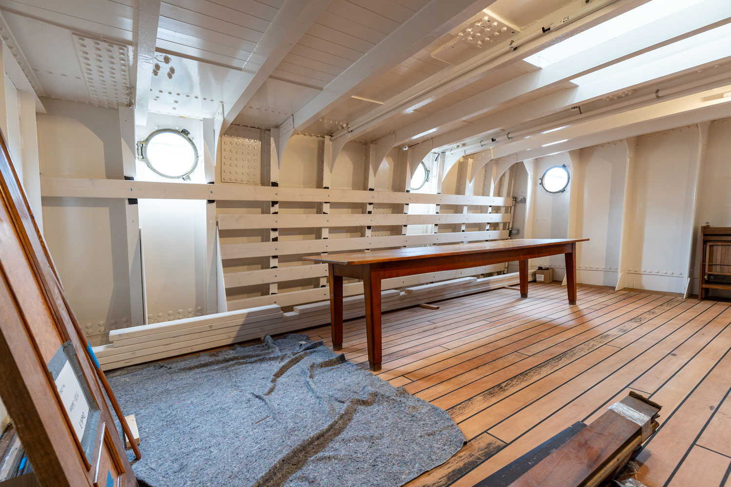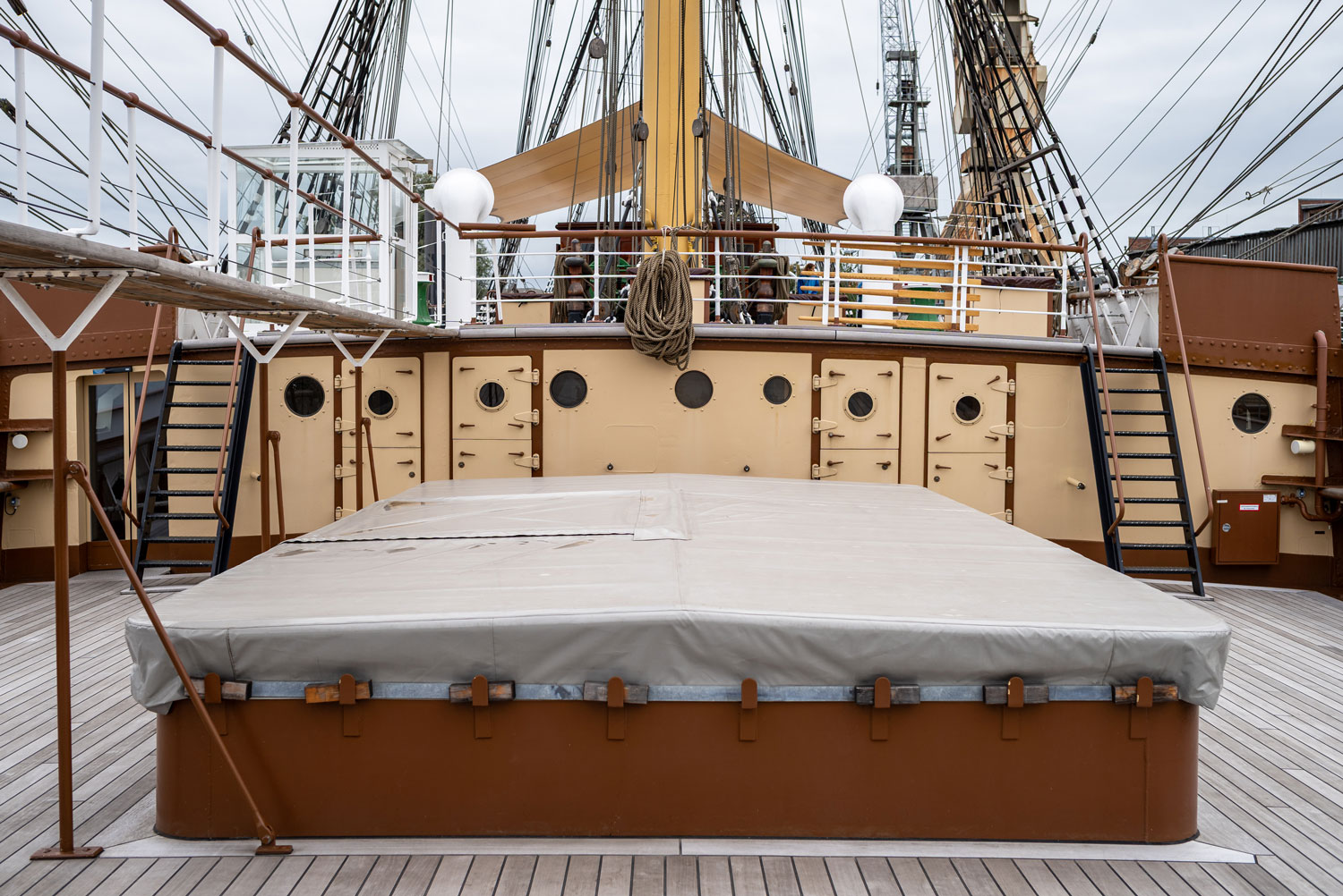 Links sieht man die Luke 3 mit nachträglich eingebautem Niedergang zum Zwischendeck aus der Arethusa-Zeit. Im Hintergrund auf dem Brückendeck das Kartenhaus. Entstanden ist das erste Bild 2017 in New York.