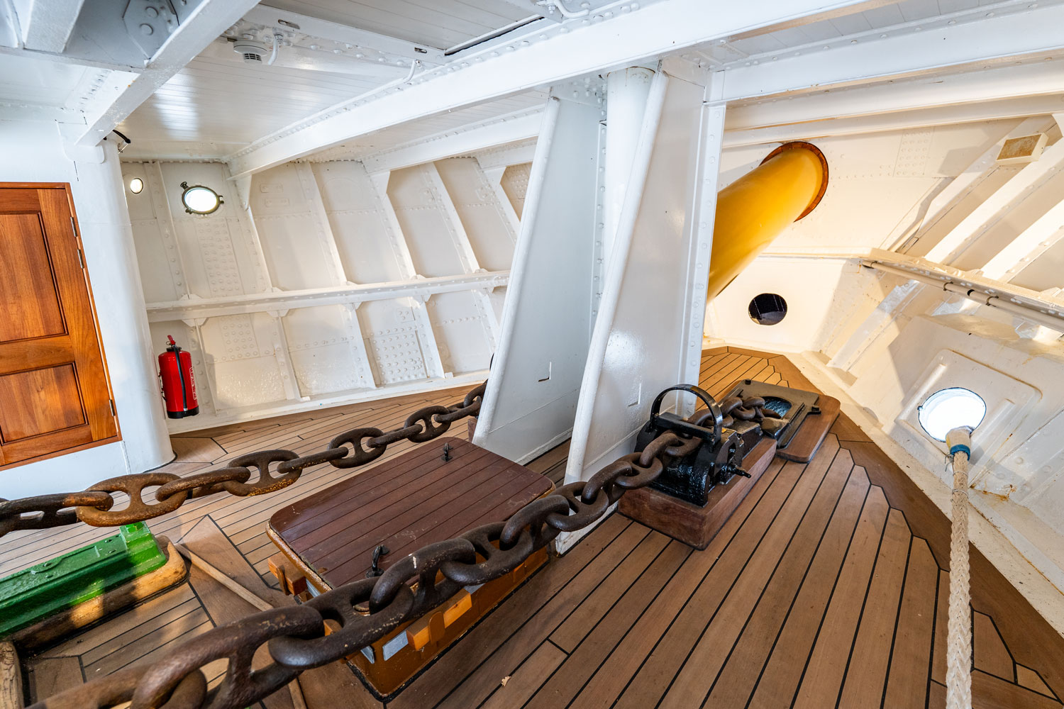 Links und rechts die Ankerketten durch die Klüsen nach außen geführt. Hinter der Kranachse die Luke zum Kabelgatt, dem Aufbewahrungsraum für Reparaturmaterialien, Balken, Tampen, Stahlseile etc.