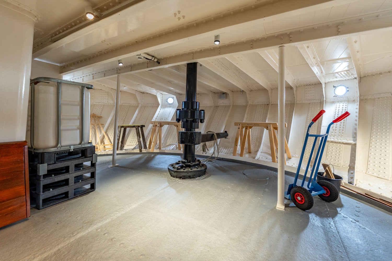 Hier befinden wir uns ganz hinten auf dem Schiff unterhalb der Notsteueranlage (Hilfssteuerrad). Die Achterpiek mit der Achse des Ruders im Heck, durchgeführt nach oben auf die Poop zum Ersatzruderstand. Die Toilette (links) und die Holzverkleidung waren nicht original und wurden später entfernt. Das Achterpiek neu lackiert. Auch wieder schwarz die Achse, an der das Ruderblatt befestigt ist.