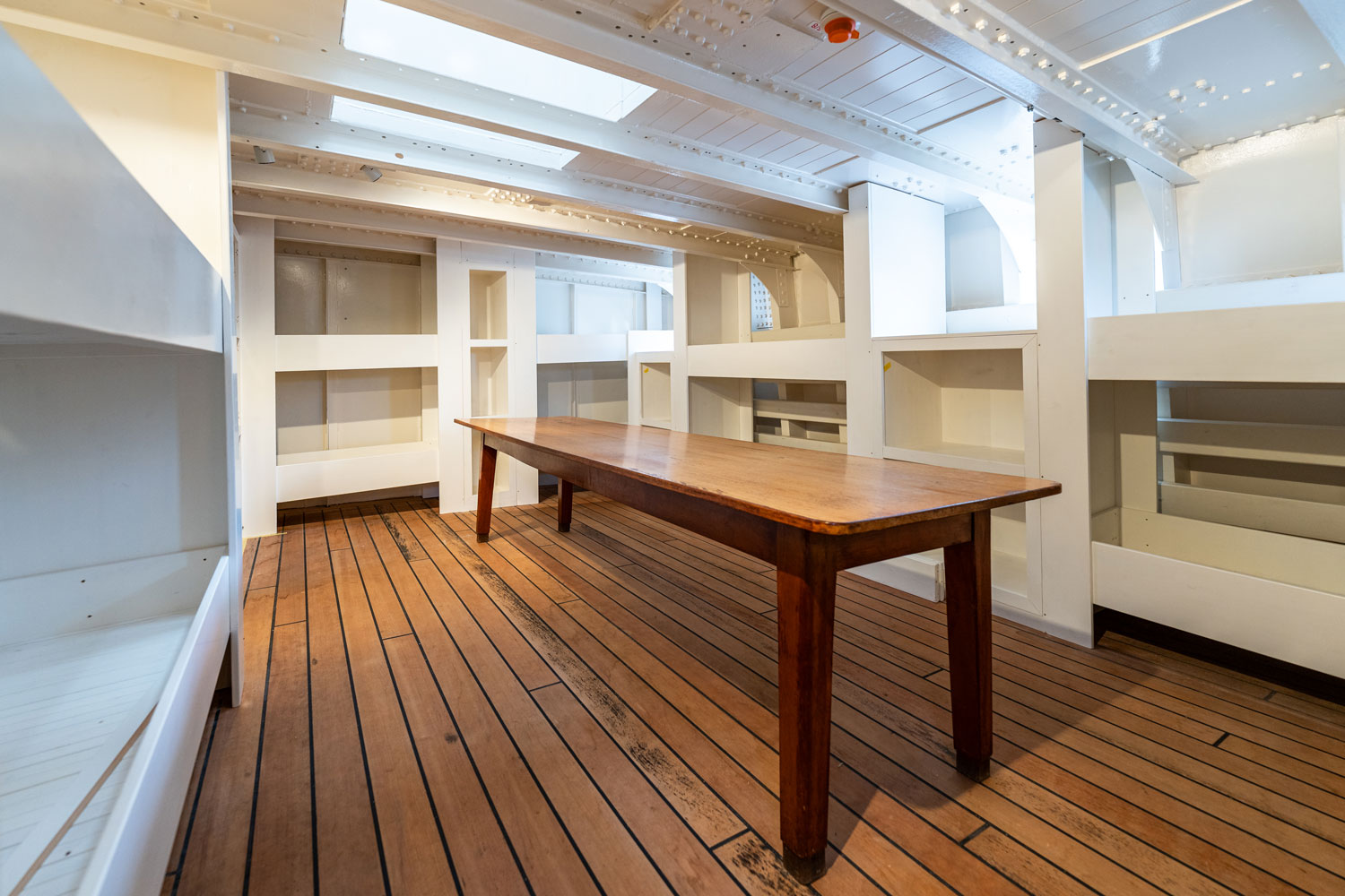 Links ist der Mannschaftsraum noch nicht zu sehen. Dieses Bild stammt aus dem April 2024. Rechts daneben der backbord-Mannschaftsraum im neuen Anstrich und mit wiederhergestellter Ausstattung von 6 Doppelstock-Kojen im Oktober 2025.