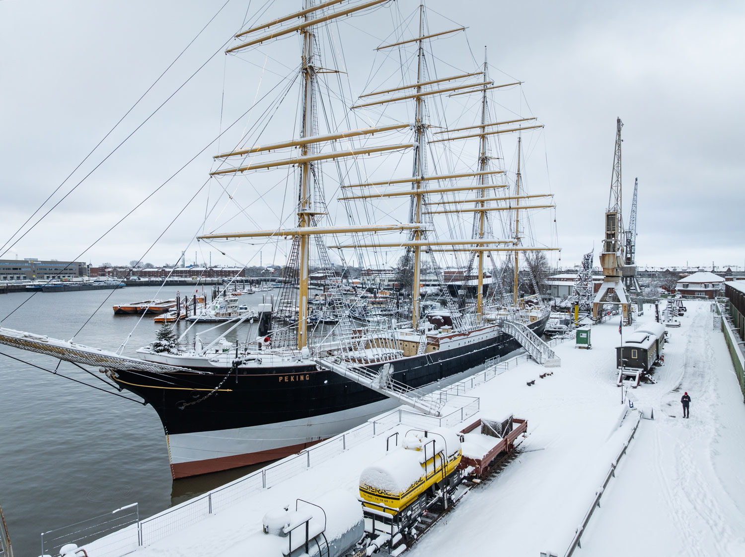 In den vergangenen Tagen wurde die PEKING an zwei neue Dalben verholt. Dafür musste das Schiff um wenige Meter nach Steuerbord bewegt werden. Nun liegt sie etwas weiter von der Kaimauer entfernt und genießt einen besseren Schutz als zuvor.